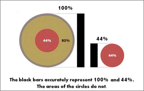 Differences are exaggerated and large values seem to be closer to 100% than they really are. Don’t do this.