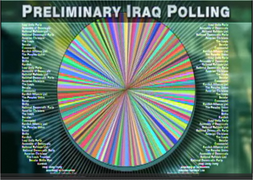 (4) Visual differentiators add noise: Graphs must often differentiate elements. A classic example is differentiating treatment and control group averages using bars of different colors. In the NYT Magazine pie chart, the poor choice of busy patterns makes it very difficult to differentiate one piece of the pie from another. The visual chaos is reminiscent of the results of a “poll” of Iraqi voters presented by the Daily Show in which a very large number of parties purportedly held almost equal levels of support.