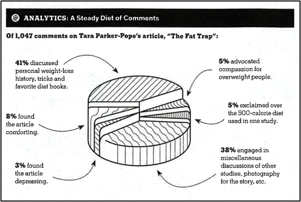 This pie chart has a humble purpose—summarize reader responses to an article on obesity in the US. It failed that purpose stunningly. Here are some reasons why.