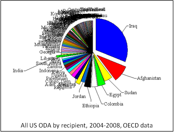 (5) Data labels add more noise: Data labels can increase clarity. In this case, however, the swarm of curved arrows connecting labels to pieces of the pie adds to the visual chaos. Even this tangle of labels is better because readers instantly understand that Iraq received a disproportionate amount of the aid provided to many countries.