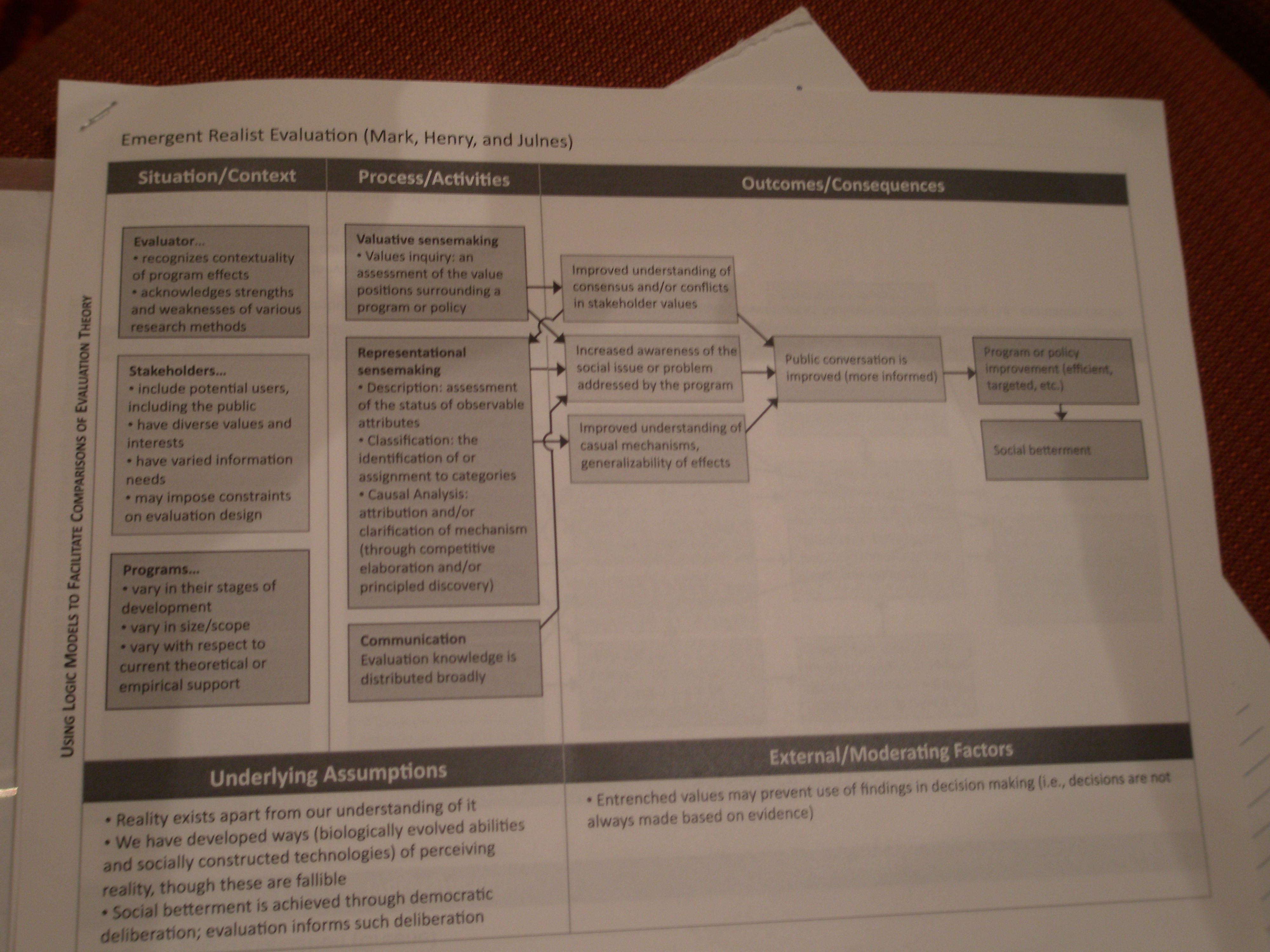 Today will be interesting.  I lead a half-day workshop on program design with Stewart Donaldson. Then I chair a panel discussion on the future of evaluation (a topic that, to my surprise, has mushroomed from a previous EvalBlog post  into a number of conference presentations and a website).